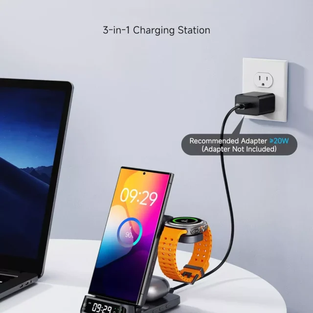 • Multifunctional Design: Charge your phone, smartwatch, and earbuds simultaneously.