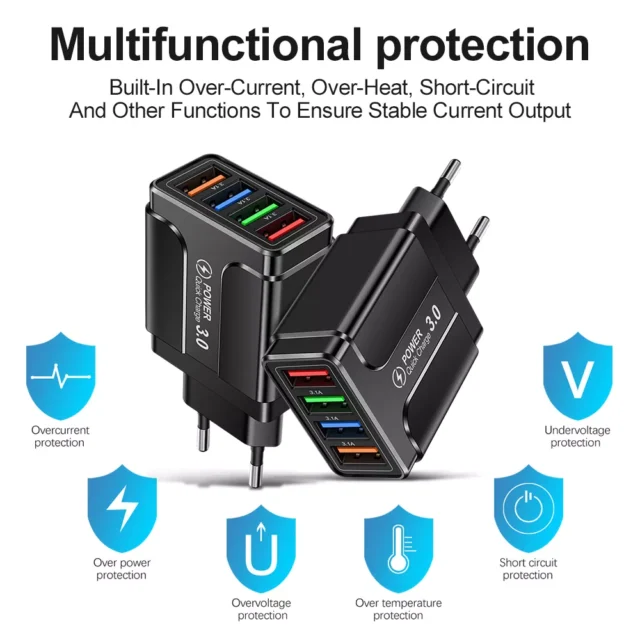 Say goodbye to slow charging and tangled cords. Elevate your charging experience with the 4-Port Quick Charge 3.0 USB Wall Charger and enjoy faster, safer, and more efficient power for all your devices. Order now and stay ahead of the game, no matter where life takes you!
