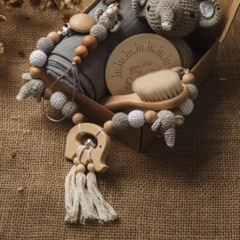 Newborn Baby Bath Gift Set – Cotton Blanket, Wooden Rattle & Milestone Toys