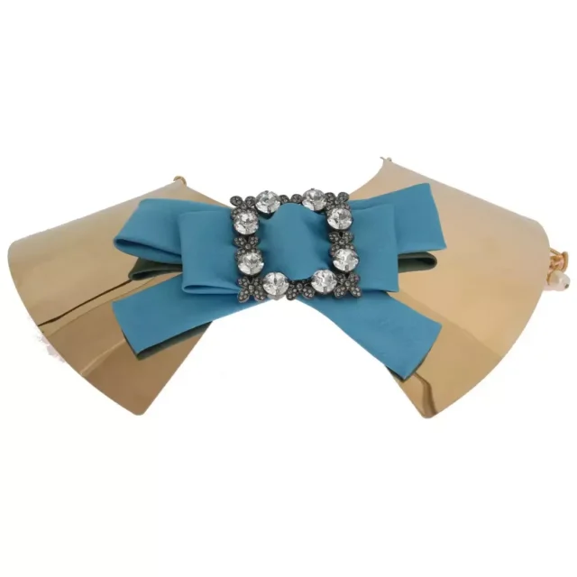 Featuring a large blue silk bow at the front adorned with sparkling clear and grey crystals, the necklace is designed to turn heads. The collar is beautifully embellished with a combination of metal, brass, and crystal accents, showcasing the brand’s exceptional craftsmanship. Whether you’re dressing up for a special event or looking to add a high-fashion touch to your everyday outfit, this necklace is the ideal statement piece.