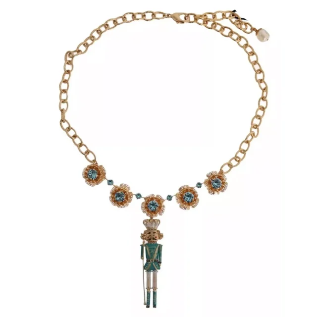 Step into the world of luxury with this stunning Dolce & Gabbana Gold Crystal Necklace. Beautifully crafted in Italy, this statement piece exudes the brand’s signature style, blending timeless elegance with bold creativity. The intricate handpainted Pupi Doll Sicily motif pays homage to Italian heritage, making it more than just a necklace—it’s an artistic masterpiece. Perfect for turning heads and sparking conversations, this necklace is your go-to accessory for elevating any outfit.