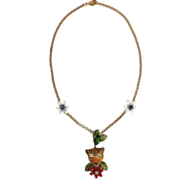 What makes this Dolce & Gabbana necklace truly special is its ability to combine modern style with timeless luxury. The multicolored rhinestones add an element of fun and vibrancy, while the gold-tone metal offers elegance and sophistication. This piece can be worn alone for maximum impact or layered with other necklaces for a more personalized look. When you wear this necklace, you’re not just accessorizing – you’re making a statement that says you know fashion, and you know quality.