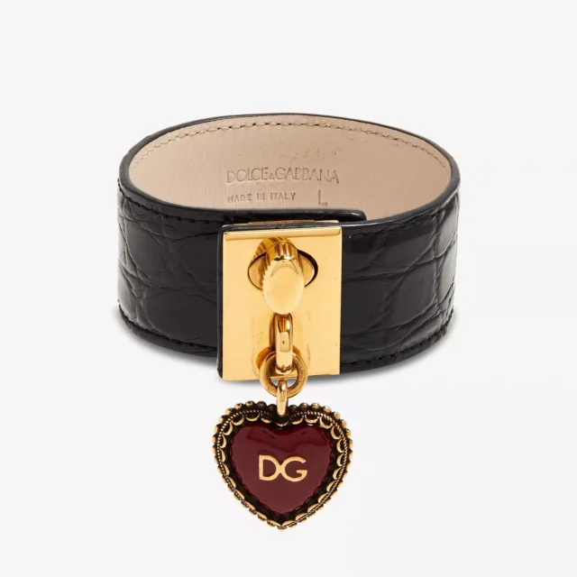 The Dolce & Gabbana Wide Leather Bracelet stands out for its impeccable combination of materials and design. The soft yet durable black leather provides a sleek base, while the gold metal detailing adds a touch of opulence. The bold wide shape makes it a standout accessory, and the Dolce & Gabbana logo detailing ensures it’s a true statement of luxury and craftsmanship. It’s not just a bracelet—it’s a work of art for your wrist.