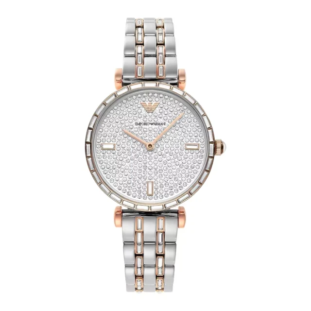 The Emporio Armani AR11293 Women’s Watch is more than just a timepiece—it’s a statement of elegance. With its sparkling crystal pave dial and distinctive two-tone design, this watch captures attention while offering comfort and practicality. The 32mm case size makes it ideal for women who prefer a watch that’s not too large but still stands out. The inclusion of baguette crystals on the band adds a luxurious touch that’s both timeless and trendy.