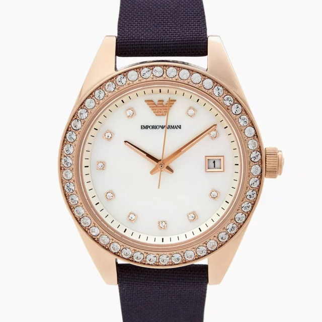 The Emporio Armani Women’s Rose Gold Watch is the epitome of elegance and contemporary style. Its sophisticated combination of a rose gold case, a pearl-toned dial, and a grey textile strap makes it a standout accessory for any occasion. Designed for women who appreciate subtle luxury, this watch effortlessly elevates your outfit while providing reliable functionality.