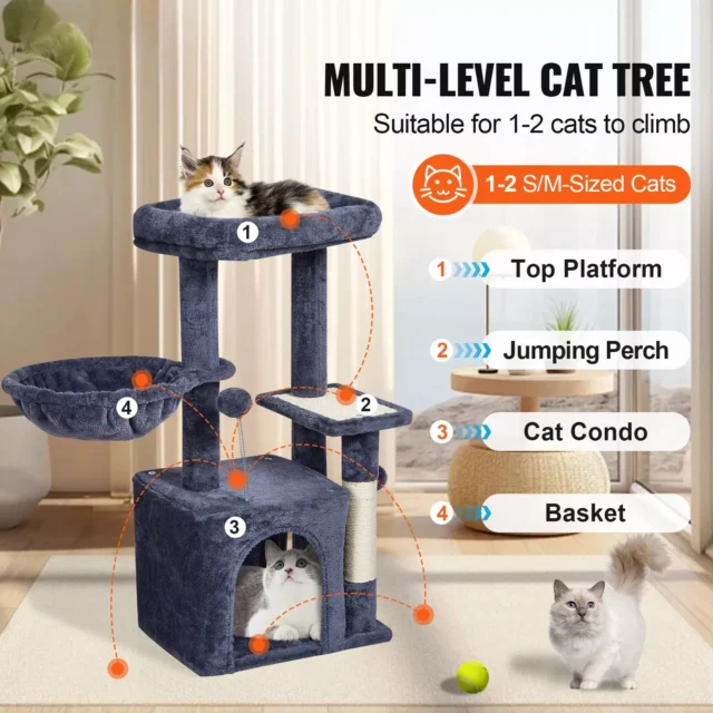 This cat tower isn’t just functional; it’s thoughtfully designed to meet your cats’ physical and emotional needs. Its multi-tier layout ensures every cat finds their own space to rest or play, making it ideal for 1-2 small to medium-sized cats. The durable sisal scratching posts provide a healthy outlet for scratching behavior, while the plush surfaces offer unparalleled comfort.