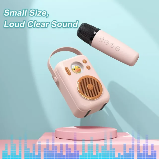 Compact yet powerful, this karaoke machine features a two-way audio system and a passive radiator for enhanced sound quality, making every song you sing resonate beautifully. With a lightweight design of just 0.77 lbs (350 g) and dimensions of 4 inches wide by 6 inches high, it’s easy to carry or store. The playful design and vibrant pink color make it particularly appealing for children and an excellent gift for any occasion.