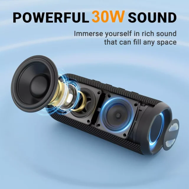 • 30W 360° Hi-Fi Stereo Sound: Experience immersive audio with punchy bass, balanced midranges, and crisp highs, enhanced by a built-in digital signal processor.