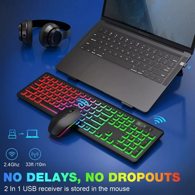 Why settle for ordinary? Upgrade to the RGB Backlit Wireless Keyboard and Mouse Combo and enjoy unmatched comfort, style, and convenience. Order now and elevate your workspace to the next level!